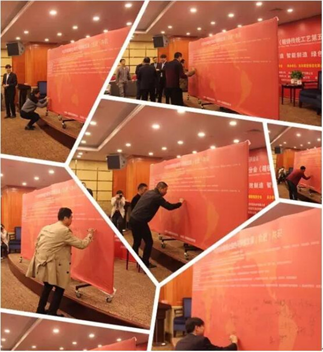 在東風(fēng)精鑄、精鑄分會(huì)組織倡議下,10月28日,傳統(tǒng)精鑄第五屆高層論壇順利舉行,來自國內(nèi)重點(diǎn)精鑄企業(yè)、科研院所、社團(tuán)等 95名代表,在安徽合肥共同見識(shí)了《中國傳統(tǒng)精鑄業(yè)綠色可持續(xù)發(fā)展合肥共識(shí)》簽字儀式,其中60余名代表在幕板上簽字表達(dá)了綠色可持續(xù)發(fā)展的決心。
