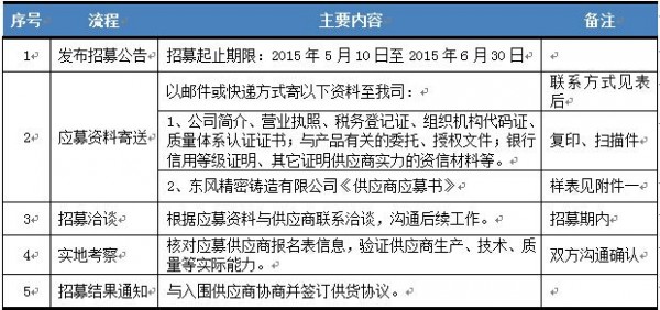 通過本次招募尋求1-2家滿足條件的覆膜砂模具供應(yīng)商,作為東風(fēng)精鑄制造業(yè)務(wù)鏈的有效組成部分。