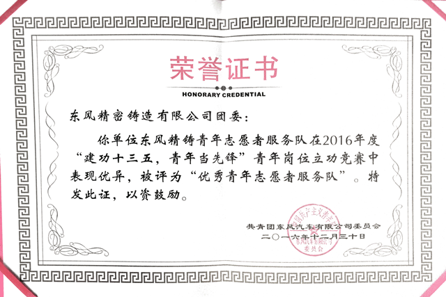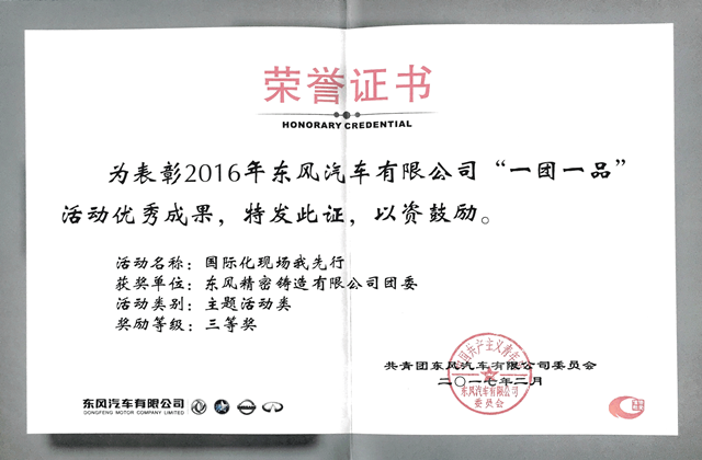2016年度,東風(fēng)精鑄團(tuán)委積極開展“一團(tuán)一品”創(chuàng)建活動(dòng),經(jīng)年初立項(xiàng)、過程實(shí)施、成果總結(jié)、申報(bào)及上級(jí)單位評(píng)定等環(huán)節(jié),東風(fēng)精鑄團(tuán)委“國(guó)際化現(xiàn)場(chǎng)我先行”主題活動(dòng)榮獲東風(fēng)汽車有限公司“一團(tuán)一品”三等獎(jiǎng)。并且在2016年度“建功十三五,青年當(dāng)先鋒”青年崗位立功競(jìng)賽活動(dòng)中,東風(fēng)精鑄團(tuán)委帶領(lǐng)團(tuán)員青年立足崗位、積極作為、勇于擔(dān)當(dāng),被評(píng)為“東風(fēng)汽車有限公司優(yōu)秀青年志愿者服務(wù)隊(duì)”及 “東風(fēng)汽車公司優(yōu)秀青年志愿者服務(wù)隊(duì)”。